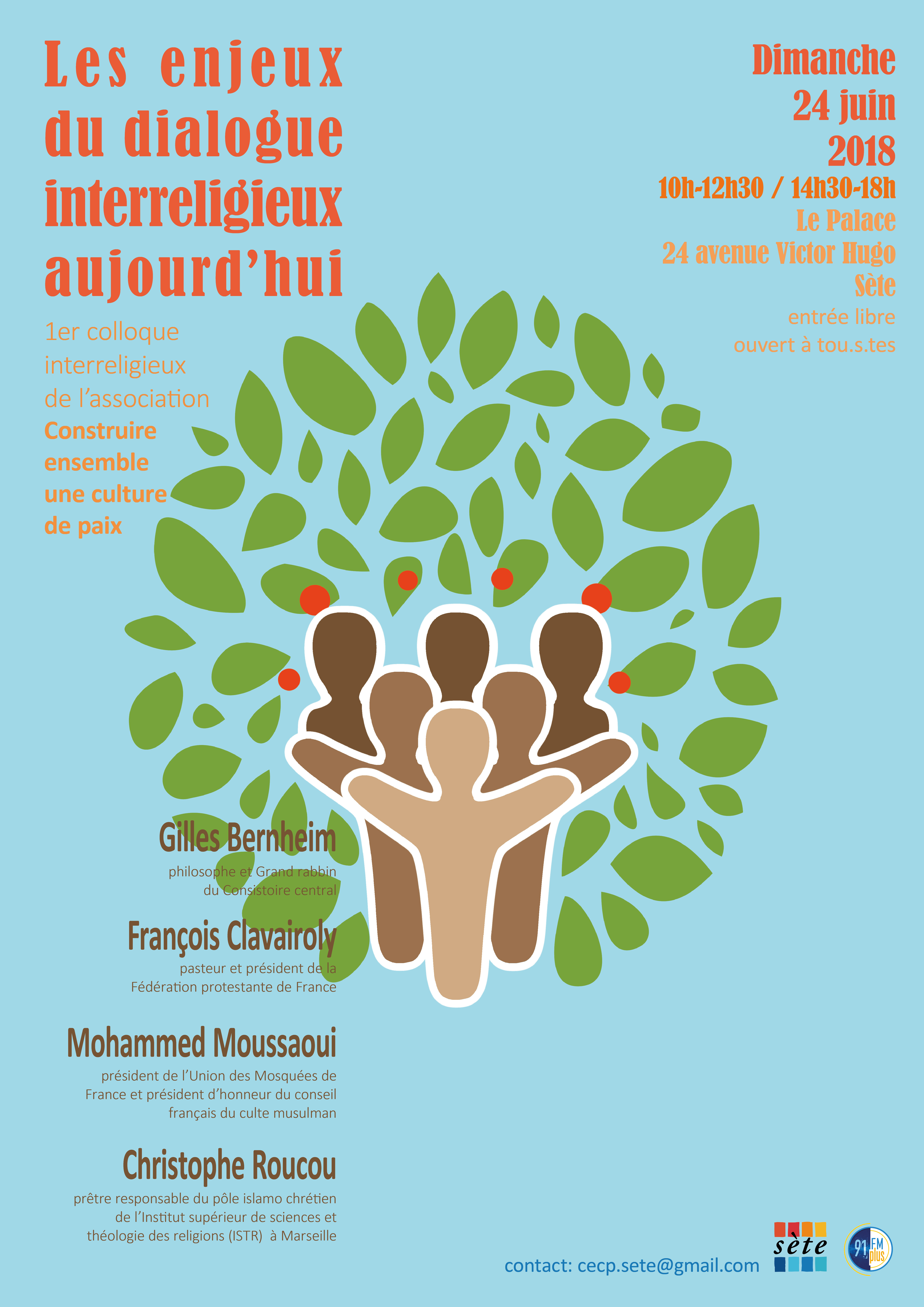 Le pasteur François Clavairoly président de la Fédération protestante de France,  le Grand Rabbin du Consistoire central Paris Gilles Bernheim,  Christophe Roucou prêtre à la Mission de France responsable de 2006 à 2015 du service pour les relations avec l'islam (SRI ) pour l'Église catholique, et professeur à l'Institut de Sciences et Théologie des Religions, (ISTR) ) à Marseille . et Mohamed Moussaoui président d'honneur du Conseil français musulman et président de l'Union des mosquées de France partageront leur perspective du dialogue entre les religions. Comment dialoguer ? Comment faire entendre, comprendre ses convictions religieuses dans le respect des convictions d'autres religions face à la montée des extrémismes ? Le dialogue interreligieux s'avère nécessaire. Des pistes de réflexion seront lancées pour qu'émerge ce dialogue entre les religions mais aussi au cœur de la société. Les uns et les autres partageront leur expérience de terrain pour qu'une réelle fraternité puisse se prouver entre les différentes communautés et dans la société contemporaine . L'association Construire ensemble une culture de paix (CECP est née en 2016 de cette volonté portée par les chrétiens juifs et musulmans de vivre ensemble dans l'observation des principes de la laïcité et promeut une culture de paix. Ce projet s'inscrit dans la réalisation d'activités diverses. A l'occasion de cette exceptionnelle journée de rencontres l'Eglise locale de Sète ouvre son temple et son jardin au 32 rue Maurice Clavel à 10 minutes à pied du Palace, pour le pique-nique sorti des sacs .