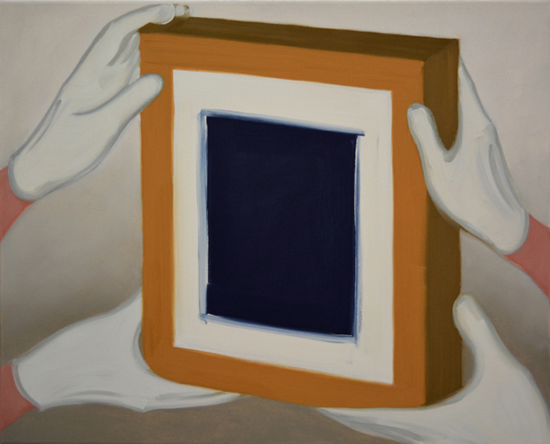 Le monde de l'Art, donc, comme espace de surdétermination du tableau. The auction (73 x 92 cm), un tableau de facture agrandie par rapport à la réalité et reproduit sur le carton d'invitation, met en scène, selon le procédé de la concaténation autrement cher à la linguistique, un tableau noir sur fond blanc (rappel de la fameuse huile peinte en 1915 de Malevitch), objet nettement matérialisé par son cadre de bois, dans le contexte d'une vente aux enchères ; tenu par quatre mains gantées de blanc, le gros plan générique sur son sujet souligne l'instant de son passage à la vente, dans le moment même de sa présentation. Obsession (130 x 195 cm) – vision plongeante dans un intérieur en format réduit constellé de tableaux – et Front desk (60 x 73 cm) – vision légèrement agrandie d'une tête dépassant de moitié la banque immaculée d'un de ces dispositifs mobiliers barrant le plus souvent l'entrée des grandes galeries new-yorkaises – complètent si l'on ose dire le tableau entrevu d'un monde de l'Art débarrassé de pathos (un vœu par ailleurs délibéré de l'artiste).