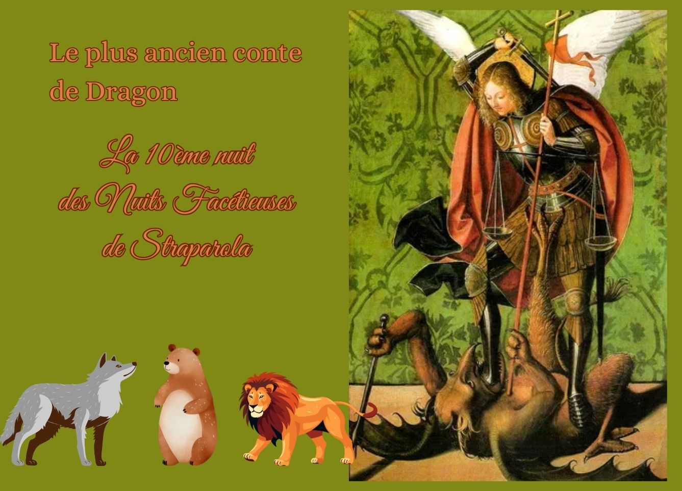 La 10ème nuit de Straparole italien né en 1480, la plus ancien conte de dragon. Comment Césarin accompagné d’un lion, d’un ours et d’un loup, quitte sa mère et ses deux sœurs, arrive en Sicile, où il découvre que la fille du Roy est exposée pour être dévorée du dragon…Césarin occis le dragon à l’aide de ses animaux…épousera-t-il la fille du Roy comme promis ????