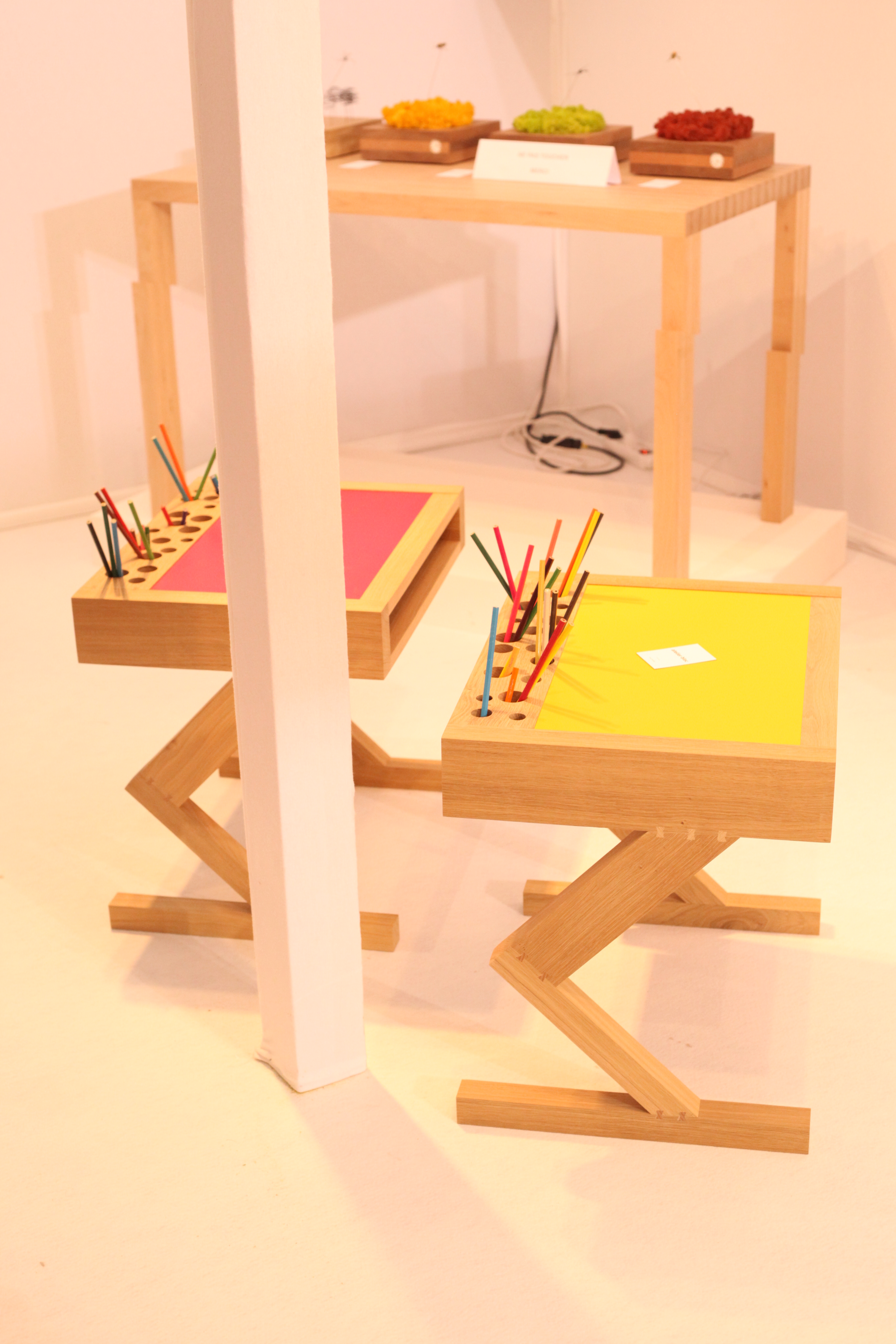 On remarque et on s'attarde aussi sur les meubles en bois et au design superbe de l'Atelier Bloc et de Kuru Design, ainsi que sur leurs horloges pour le moins originales. Ils proposent également des créations pour le mobilier d'enfants, comme leurs petits bureaux pour dessiner.