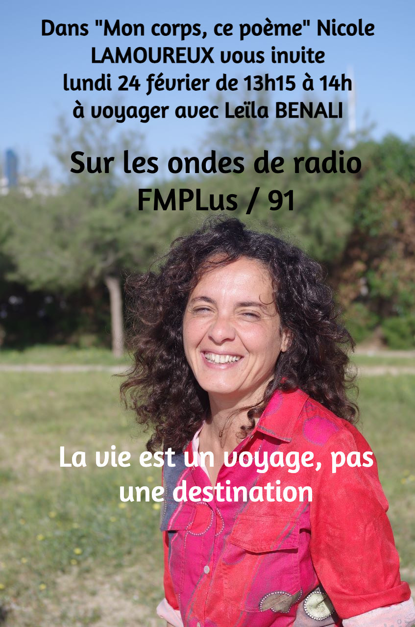 Mon corps, ce poème » avec Nicole Lamoureux. Une émission vitaminée chaque 2ème et 4ème lundis du mois, de 13h15 à 14h sur FM Plus 91. J’accueille des invités, art thérapeutes/artistes pour parler avec eux créativité, arts, danse, écriture, musique, projets, réalisations et soins. Musiques et interviews en direct rythment ce temps d’antenne ouvert à nos univers créatifs, nos expressions singulières et dynamisantes, nos rendez vous sur Montpellier et ses environs ».